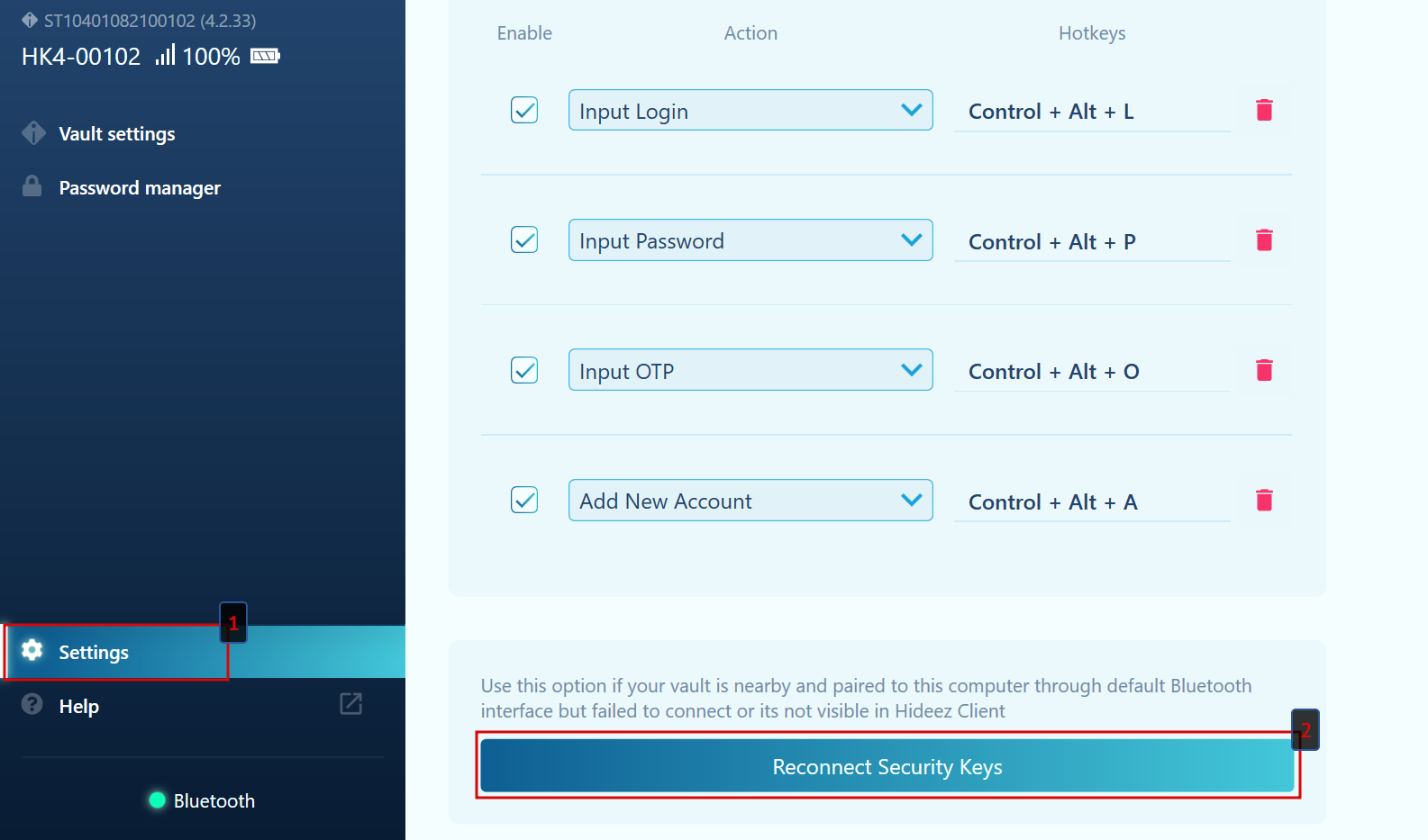 This option is available only if you use IPI Key on Windows 10/11 with a built-in Bluetooth and have installed IPI Client.If your IPI Key is paired with Windows but does not automatically connect to IPI Client, you can use the forced connection option.Go to the Settings section and click the Reconnect paired vaults button.